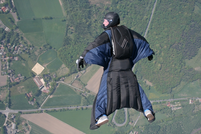 Ein Wingsuit ist ein Flügelanzug für Fallschirmspringer (und Basejumper) mit Flächen aus Stoff zwischen den Armen und Beinen,
