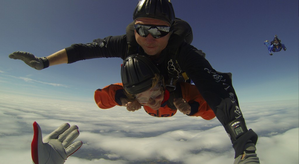 Ihr Tandemlehrer springt gemeinsam mit Ihnen in einer Höhe von ca. 4.000 m aus dem Flugzeug und steuert Sie bei knapp 200 km/h im freien Fall bis zur Schirmöffnungshöhe, während Sie die Welt von oben betrachten können.